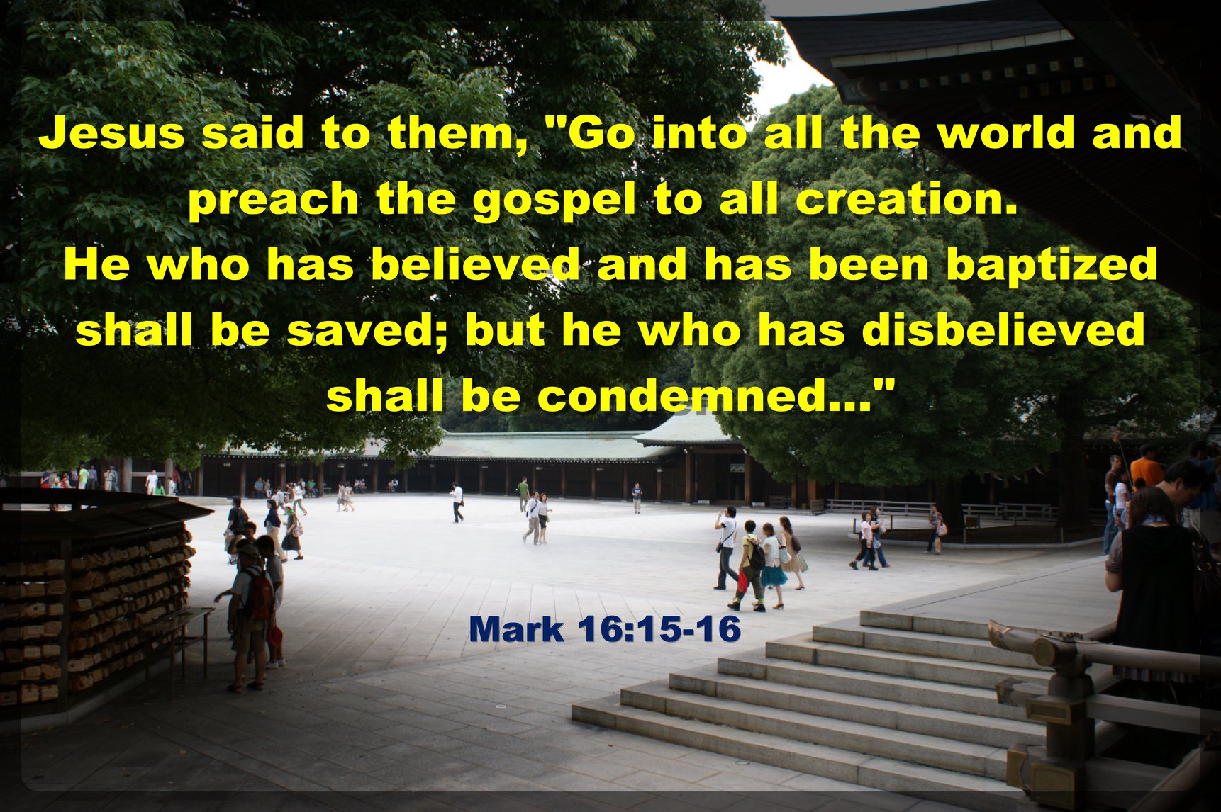 And He said to them, "Go into all the world and preach the gospel to every creature. Whoever believes and is baptized will be saved, but whoever does not believe will be condemned." (Mark 16:15-16).