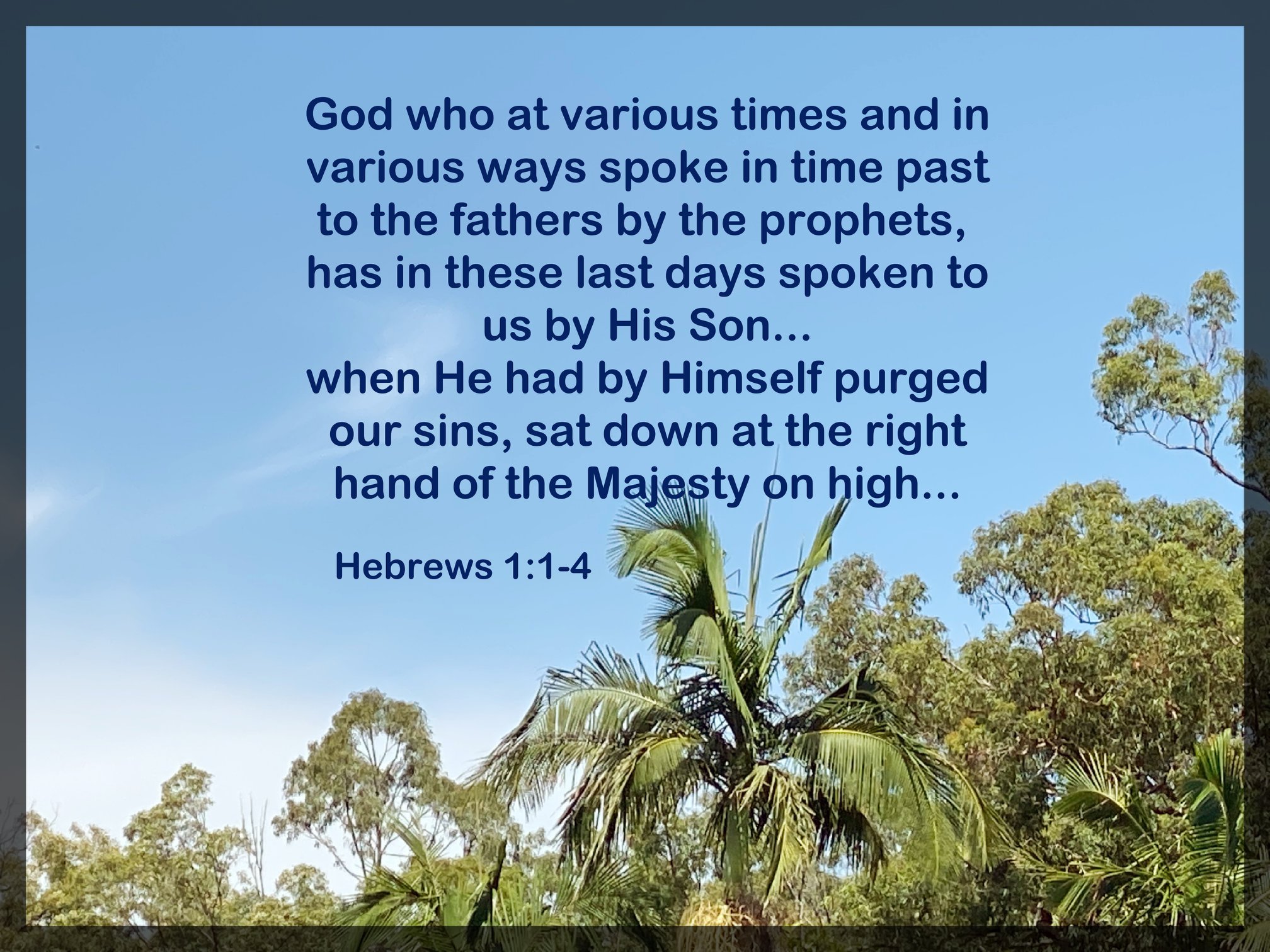 1"God, who at various times and in various ways spoke in time past to the fathers by the prophets, 2has in these last days spoken to us by His Son, whom He has appointed heir of all things, through whom also He made the worlds; 3who being the brightness of His glory and the express image of His person, and upholding all things by the word of His power, when He had by Himself purged our sins, sat down at the right hand of the Majesty on high, 4having become so much better than the angels, as He has by inheritance obtained a more excellent name than they" (Hebrews 1:1-4 NKJV).